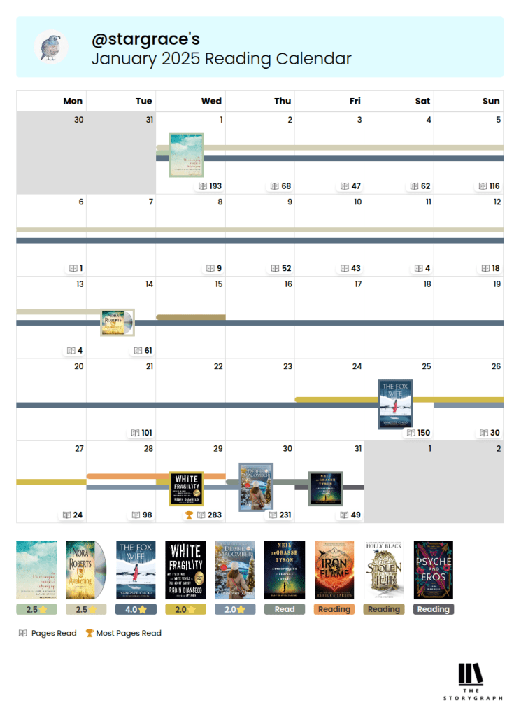 Not a bad month of reading at all! Even though I didn’t read any 5 star books, I still managed to get a lot done. It was also a great combination of audio and physical/e-book. I’m absolutely loving The Storygraph for tracking my reading. If you’re looking for more friends to add over there, you can check out my profile. Happy reading!