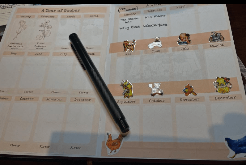 One of the book challenges I’m doing this year is “A Year of Goober” from the book club that I belong to. The challenge is pretty simple, there’s two prompts for each month, and each one coincides with a flower. You can do either of the prompts, and at the end of the year you have a bootiful (beautiful, but Goober is a ghost, see?) bookuete (bouquete) of flowers. So far I’ve got January and February planned out, January is a Carnation “your favourite author” and I went with Holly Black, and then February is a violet, “continue a series” and I went with Iron Flame (I can’t wait to read the next book). On the left hand side I’m pasting the prompt along with the flower (I printed them out onto sticker paper) and on the right hand side I’m writing down the book and the author, but I think instead I might print out the covers and stick them there. This is my 2nd attempt at this layout, I had an earlier version that I just wasn’t loving at all. I can’t wait to see what it looks like when it’s completed at the end of the year!