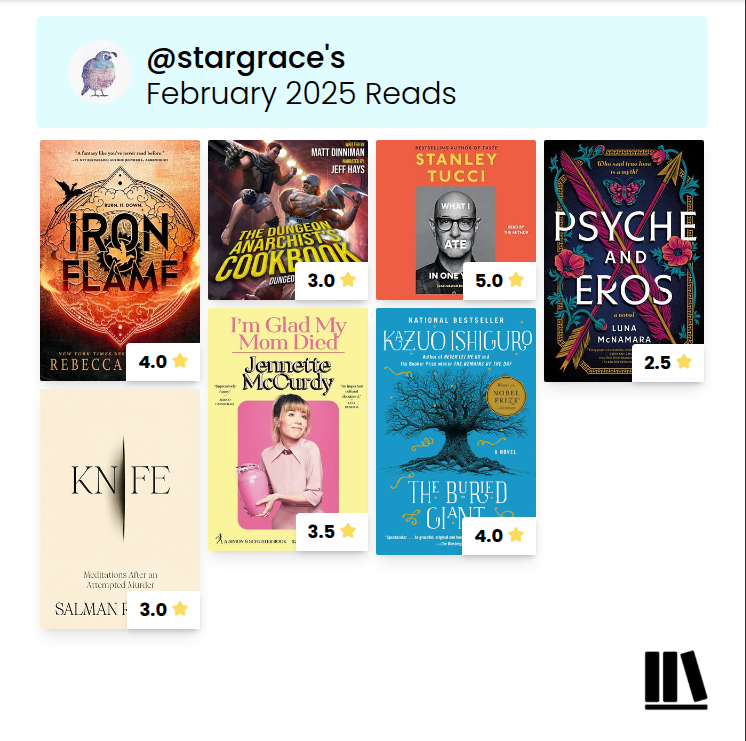 The graphics are from TheStoryGraph which is my book tracking site of choice these days. If you’re into statistics, this is where you want to be. They even include a calendar of all your reading updates. Looking at February, I see it was another big month for books and I really hope that carries over into March, but if it doesn’t that’s alright too. I read a total of 7 books (29% of those were audio books, the rest were physical & ebooks) and my average rating was 3.57 – I only had one 5 star read, and that was ‘What I ate in One Year’ by Stanley Tucci.