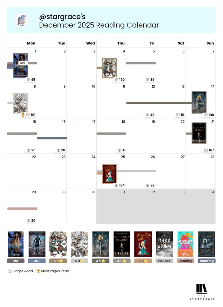 Two amazing reads for the month were ‘When Among Crows’ which is a trilogy that I hope to continue, and ‘Piranesi’ which is a stand alone novella. Piranesi in specific really caught me off guard, and I found it fascinating, I really enjoyed it (it was also a library read, yay). Automatic Noodle also came highly recommended by mutuals, and it was on sale so I picked that up (another Novella, I don’t imagine this one will take me too long to read). For Christmas I received the Art of Witch Hat Atelier, which is just absolutely gorgeous. I spent the day just lost in the images, it was so inspirational. I love the details. I did not make much progress on the Emily Wilde book, but that is not the fault of the book, I simply wasn’t in the mood this month. I hope to continue it and finish it off in January, but if not, that’s OK too.