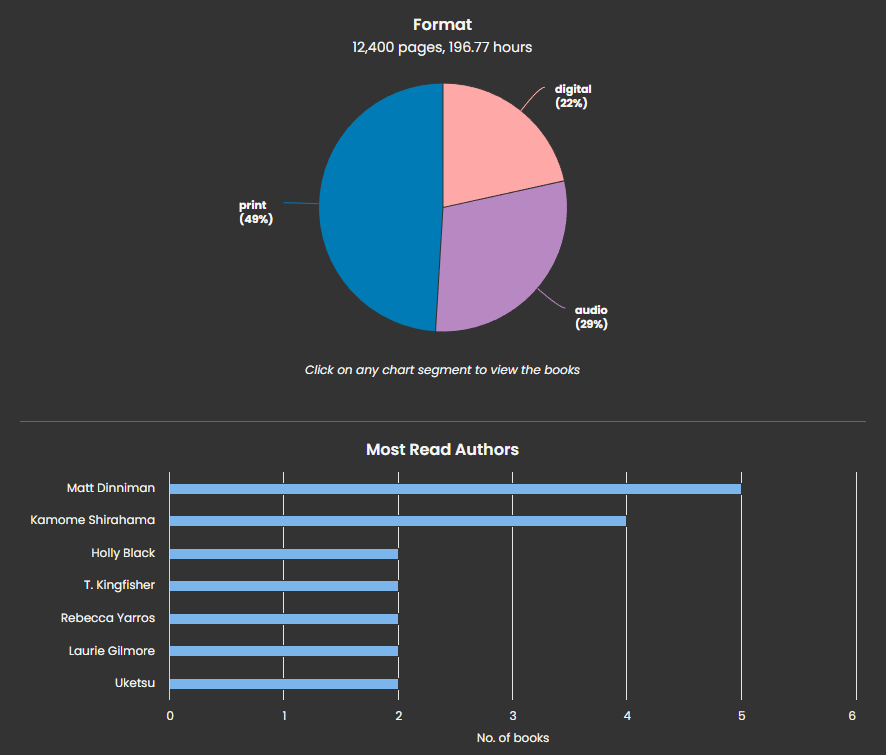 I spent around $300 on books this year, and read most of the ones I purchased (the rest I hope to finish reading in 2026). One of my biggest purchases was a 1-6 box set of Witch Hat Atelier, which came to $120 and I admit right off the bat this was for a ‘I want to collect it’ reason – though I did read and enjoy it a huge amount. I also saved more than $300 by borrowing books from the library, and this also afforded me the opportunity to explore authors I had not heard of before, along with browsing through a lot of Canadian authors which is something that I actively strive to incorporate in my reading each year.