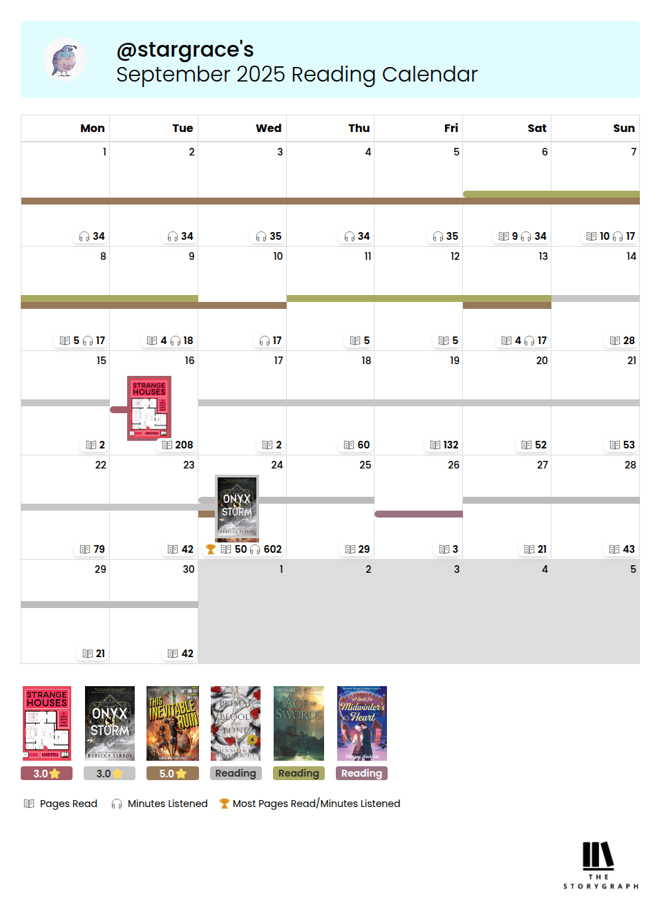 It feels like I never read as much as I want to these days, but I did get through a few books in September, and started some new ones. I picked up Strange House when it was on sale from Kobo, this book started out on YouTube and was originally in Japanese, but has been translated. I’ll make sure to post the details about each book when I do the reviews, but coming as no surprise – This Inevitable Ruin, book 7 in the Dungeon Crawler Carl series. 5 stars. Absolutely. It was a heavy read, but so well done.